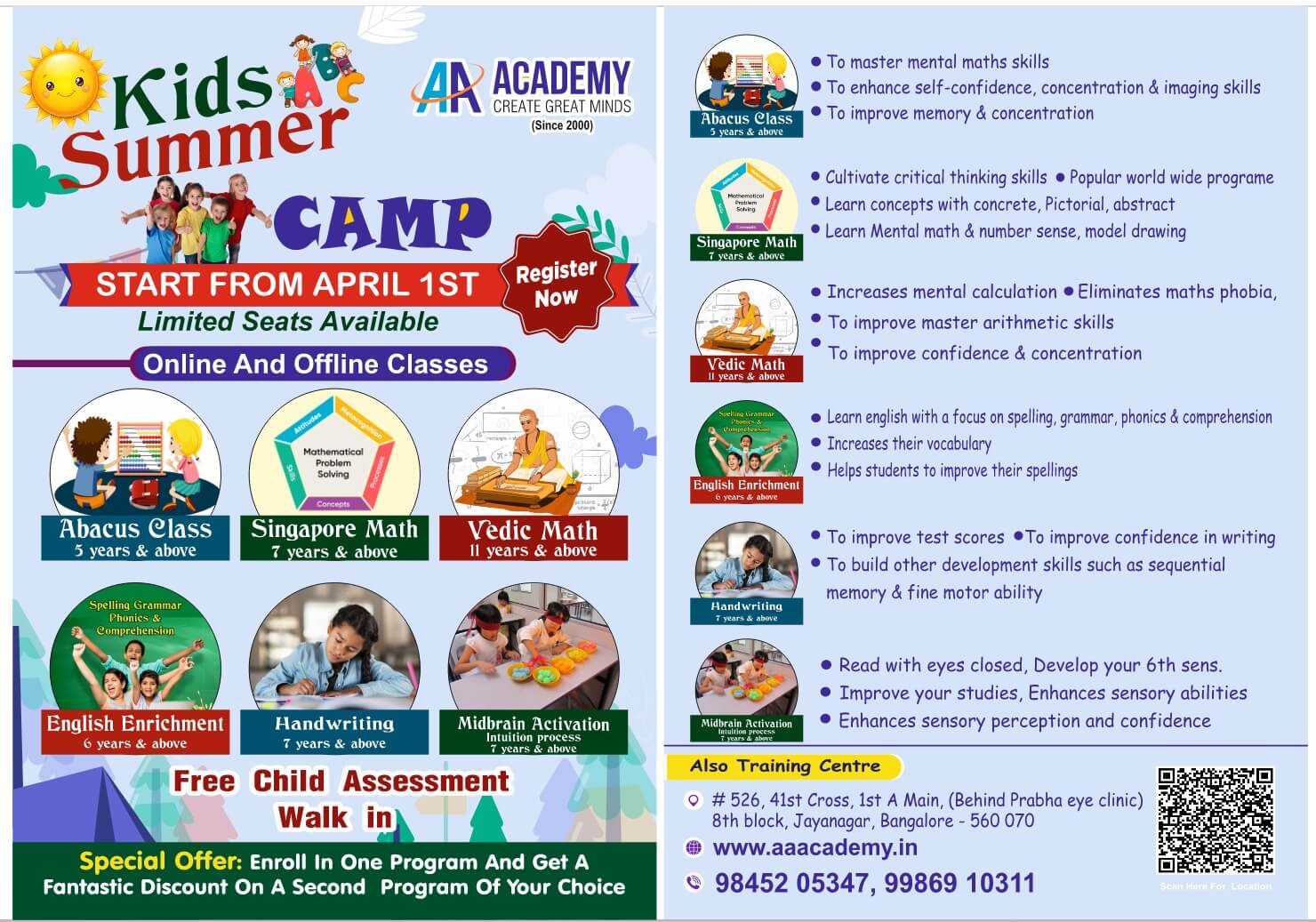 We are the earliest abacus training institute in Jayanagar, Bangalore. AA Academy's program of abacus & mental arithmetic is the first of it's kind in Karnataka. Our extensive collection of specially designed courses activates and rejuvenates "Brain Power", sharpens concentration and comprehension skills, enhances listening skills, and germinates speed with accuracy in presentation abilities and boosts the self-confidence in children to face vicissitudes of life.